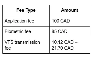 Canada tourist visa fees include 100 CAD application fee and 85 CAD biometric fee, excluding VFS passport transmission charges.